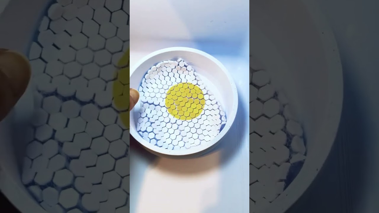 Ovo Estalado Sensorial: Uma peça plana em formato de ovo frito, com uma textura geométrica de colmeia super moderna e envolvente ao tato.